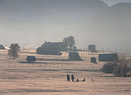 【お散歩】牧草地が広がるこの地方では雪の牧草地が運動場になる。両親が子供を乗せた橇を引きながら散歩を楽しんでいる。ゆったりした時間が流れていくのが羨ましい。