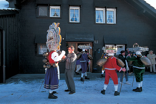 【新年の祭り】この地方はスイスの旧暦を使って農作業にあたっている。毎年1月中旬にウルネッシュで行われる祭りだが。男性だけの祭りで頭の飾りや森の悪魔のような格好がユニーク。ヨーデルの門付にうっとりする。