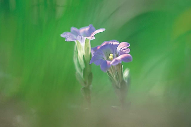 【フデリンドウ】邪魔な草は、形が残る程度にボカして草むらの雰囲気をだす。花びらの下は影になるので、レフを当てる。