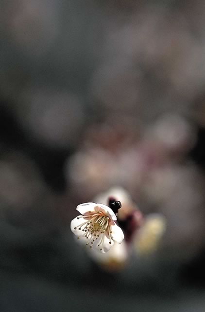 【ウメ】枝先の花を選び、後ろの花はボカして背景を埋める。半日陰の背景を選べば花が浮き出してくる。