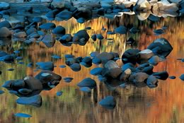静かな流れが水鏡となって、対岸の紅葉を映していた。色鮮やかな秋の季節の輝きは、本当にゴージャスである。