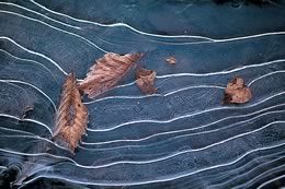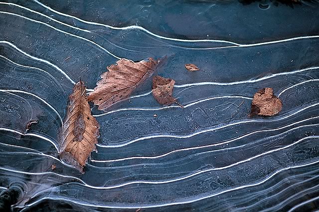 一口に氷といっても、その形や出来方は千差万別。落ち葉を封じ込めた氷紋が美しい冬の造形。