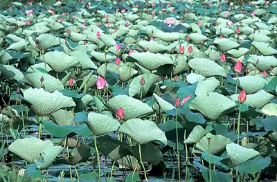 湖一杯に繁茂したハス、風が吹き抜けると大きな葉っぱが一斉になってお辞儀をした。