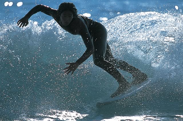 隠し撮りなどはせず、基本的には全て事前に被写体となる人物の了解を得て撮影をするのが信条だとか。遠くて声が届かないサーファーなどには、後日できあがったプリントを海岸へ持っていき、本人や友人などに配って了解をもらっているそうです。