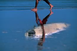 【海鏡】5月のある晴れた大潮の干潮時、海原は鏡のように輝き、サーファーの白い足がとても印象的で、強調してとらえた。