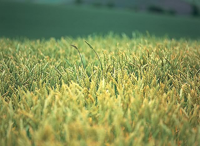 【初夏】初夏の美瑛の畑。絞り込んで畑を広く取り込んで畑模様にするのが一般的だが、私の目には、麦秋の何本かの穂が若々しく飛び跳ねて見えた。