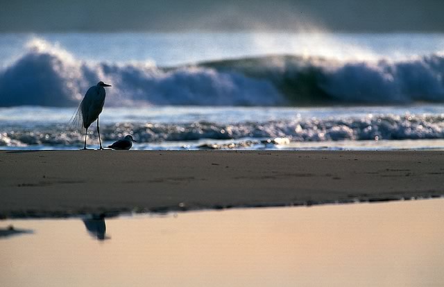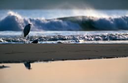 【潮騒】5月の夕暮れ、斜光がやわらかく渚を包み、サーファーも上がって、誰もいない海。鳥がゆったりと海を見ていた。静かな海に波音だけがこだまし、よせてはひいていた。