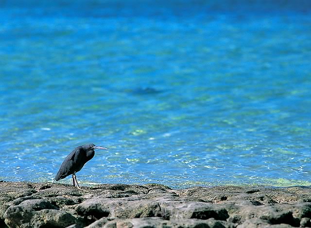 美しく透き通った海岸線の一角、岩場の一角にクロサギが羽根を休めていた。