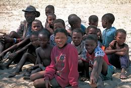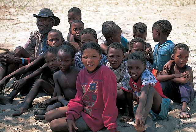 ブッシュマンの人たちが、三々五々集まってきて日陰に座り込んで、人懐っこく見つめていた。