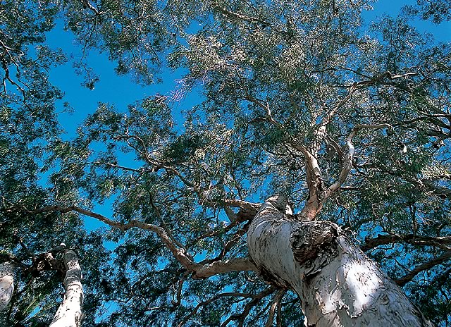 青空に向かって伸びたユーカリの樹木、白い幹と緑色の葉が美しく輝いていた。