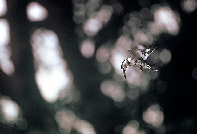 空中の一角でホヴァリングするヤマセミ。白黒の斑模様が輝いていた。