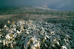 【初雪降る】この朝、外気が冷え込んで草津白根の山腹に雪が降り積もった。雪は降った直後が美しく降って時間が立つと雪面が汚れてくる。朝の光を意識しながらフレ−ミングした作品。