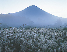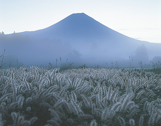 【白露の原】冷え込んだ早朝、チカラシバの穂に露が一面に付着し、富士が霧の間から顔を出した一瞬です。