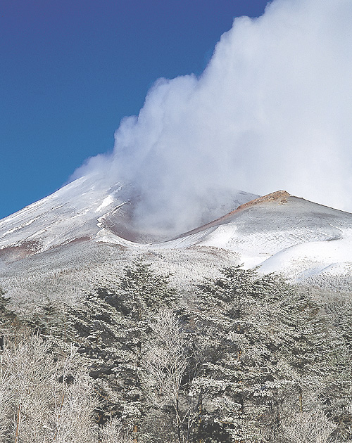 【宝永火口に雲立つ】裾野市の水ヶ塚公園から仰ぐ富士は天に向かって大きな火口が口をあけています。山旗雲の一部が火口に流れ込み噴煙のようになりました。