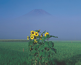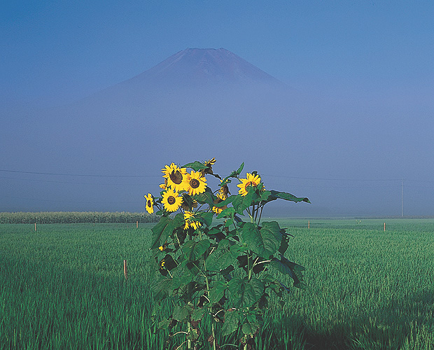 【ヒマワリ】忍野村では毎年ヒマワリ畑が賑わいます。少し外れた稲田の畦に取り残されたように数本のヒマワリが咲いていました。霧が去って富士が見えるのを待ちました。