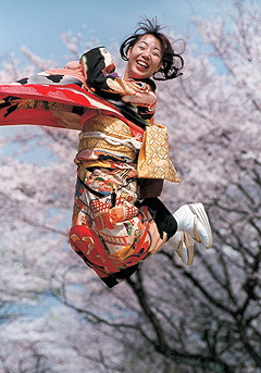 県内有数の桜並木をバックに、飛び上がる女性。芝生の広場だけでも4ヘクタールの広さというから驚き。