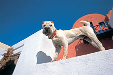 ふと顔を上げると、塀の上には自分と並んで歩く犬の姿が。サントリーニの犬たちは、カメラを向けると楽しそうにのぞきこんでくる。