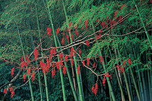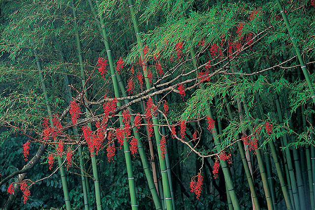 【飯桐】竹林からせり出すように枝を伸ばした飯桐が、房状の赤い実をたくさんぶら下げている。あまりに見事な緑と赤のコントラストに、思わずうっとりしてしまった。