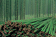 【伐竹】伐られた真竹が丁寧に積まれてあった。雨に濡れて緑が冴え、切り口が白くて新鮮である。現代に息づく伝統的竹文化の片鱗に触れたような気分であった。