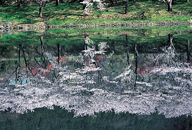 数百メートル上流の調整ダムのおかげで川面はいつも穏やか。逆さに写った桜が幻想的な雰囲気を醸し出しています。