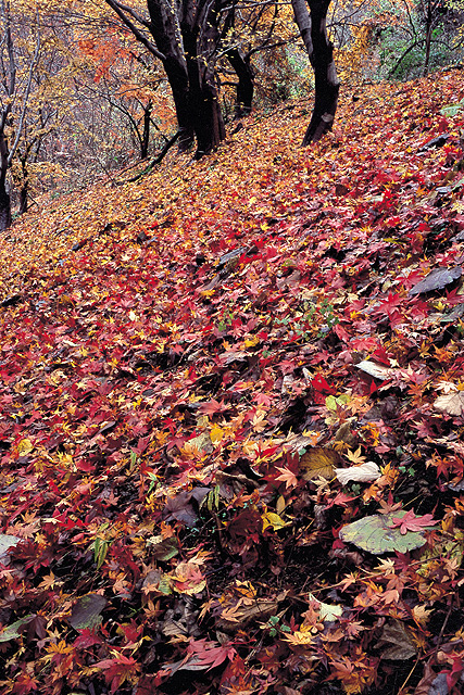 下久保ダムの埼玉県側の斜面は、秋になると一面のモミジの海に。雨で湿った落ち葉がおすすめですが、傾斜が急なので、足元に十分注意しましょう。