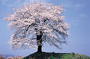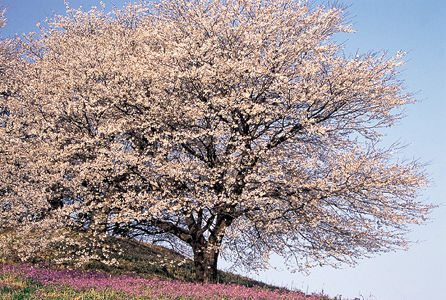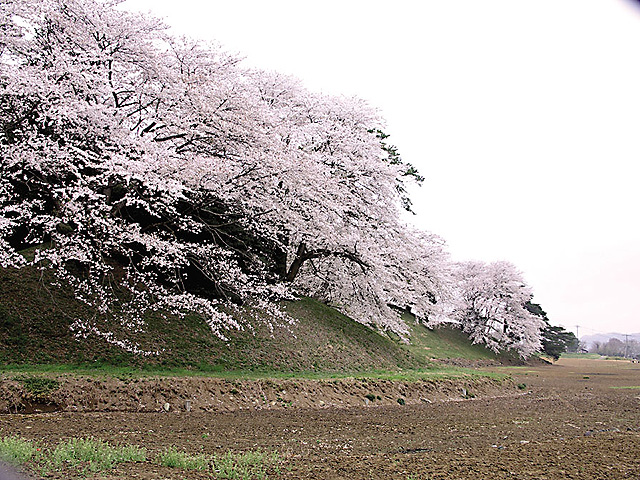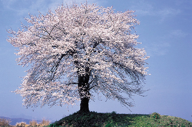 これも白石古墳群のひとつで、お茶碗をひっくり返したようなこんもりとした小山の上に、桜の木がチョコンと乗っている姿がどことなくユーモラス。青空の中に桜だけをトリミングすることも可能。