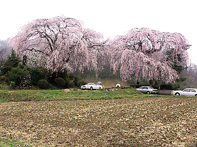 私たちが到着した頃は、あいにく小雨になってしまいましたが、ほんのりとピンクに染まる兄弟のような2本の枝垂れ桜が寄り添うようにそびえていました。周辺は田畑で、背景は小山に囲まれるというまさに被写体として存在するかのような絵になる桜です。取材当日も数人のカメラマンが周囲からベストショットを狙っていました。