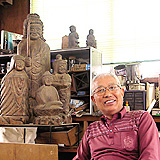 取材前、以前は猟師だったと聞いていたのですが、ご自宅におじゃましてみると裏には板金工場があり、棚には製品のアルミケースが飾られ、その隣にはご自分で彫られたという木彫りの仏像も置かれていたり。