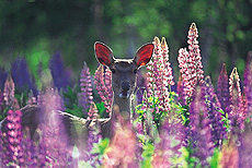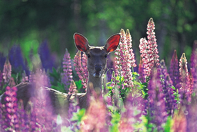 【ルピナスとエゾシカ】7月上旬、一面にルピナスの花が咲く。早朝はエゾシカがやってくる。しかし、撮影チャンスは数日に一度。チャンスが来たときの集中力が必要だ。