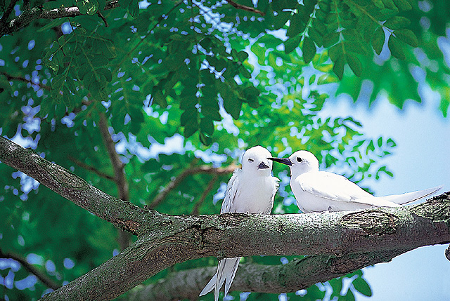 【シロアジサシのペア】いつも仲むつまじいシロアジサシ。見ているこちらがあてられっぱなしだ。グリーンの背景を活かし幸せいっぱいを表現したかった。