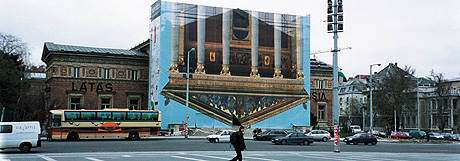 さて、写真はハンガリーの首都ブダペスト市内を観光しているときに出会った風景である。ミーチャルノク現代美術館がまさに改装工事中だったのだが、その工事現場を隠すために張られたテント地に、その完成後のイメージがなんと、天地を逆にして描かれていたのだ。