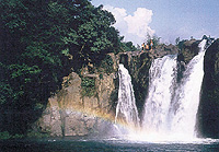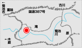 〈4〉この滝は一般的にはあまり知られておらず、観光的にも未整備なため、地元の方に現状を聞いてから出かけた方がよい。 〈5〉菊池市から国道387号を菊地渓谷方面へ進み、古川地区まで約20分。そこから菊地川沿いの道を下流方面へ約10分で滝地区駐車場。さらに下流へ徒歩約15分。