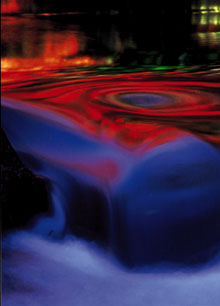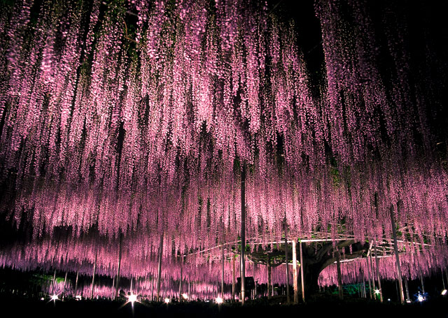 一度は見ておきたい大藤棚。夜になるとライトアップされて、日中に見せた表情とは異なる妖艶な姿が出現します。 |