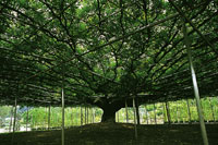 広さ82,000u(東京ドーム約7個分)。園内の地下には、環境浄化効果があるといわれている木炭の粉が埋設されています。樹齢130年以上、幹回り2〜3mの藤棚が4本。樹齢70年以上の藤が160本、白藤のトンネルの全長は80mと、「藤」が有名なところです。