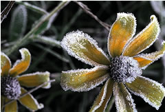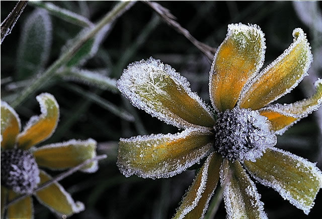 【霜の朝】北海道上士幌町で、早朝に出会った霜の風景。遅れて咲いてきたハンゴソウの花びらに、霜が付着して面白いアクセントを見せてくれた。