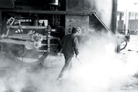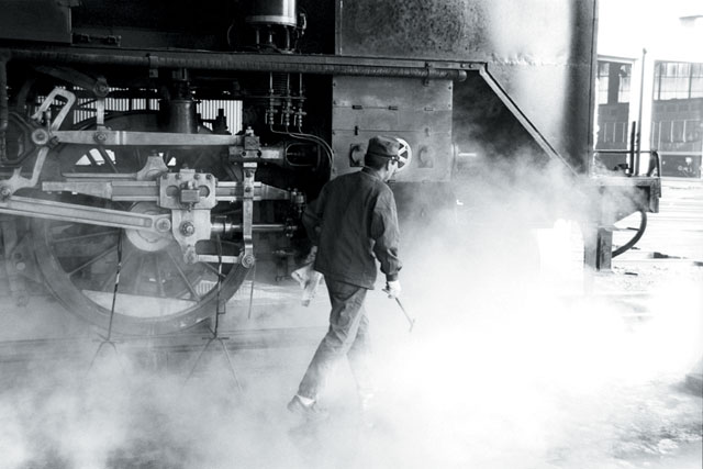 【始業点検】只見線に復活した蒸気機関車。庫では入念な点検が続く。久しぶりにモノクロで撮ってみた。