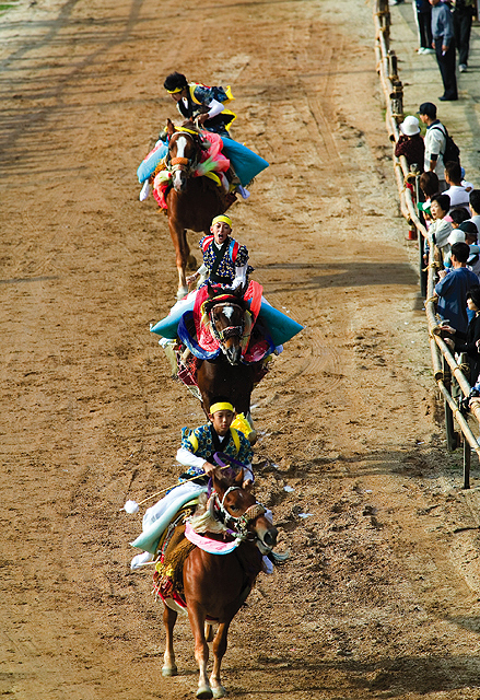 お祭り用の装飾具を身につけた6歳から15歳ぐらいまでの子供が、正装した馬に乗り、境内を一気に駆け上がります。