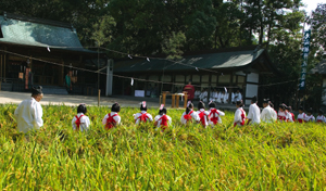 参道の右手の一角には御田植祭に使われる水田があり、頭にのしを付けた巫女が田植えをし、また独り相撲の「一人角力」が奉納されます。