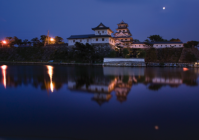 ライトアップされた今治城。ぽっかり浮かんだ月が、海水の掘に写ります。 |