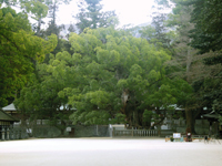 | 【大山祇神社】鳥居付近から望む、樹齢2600年の立派な楠の御神木。拝殿が背後に隠れてほとんど見えないほど。 |