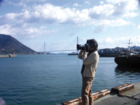 | 瀬戸内しまなみ海道大三島橋近くの港にて。本州(?)の造船所にレンズを向ける浜田さん。 |