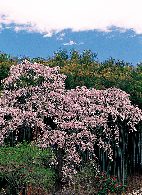 【雪村庵の桜】姿の美しいシダレ桜である。竹林の前で美しい姿を見せてくれる。桜と竹と、ツバキの花が情感をかもし出している。