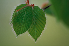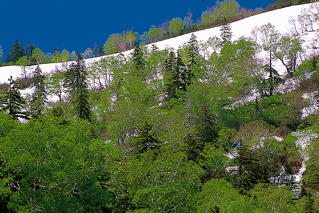 【新緑と残雪】北国の春は残雪の中にやって来る。新緑の緑との美しいコントラスト。