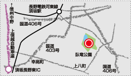 (5)上信越自動車道須坂長野東IC降り須坂南へ。幸高町の信号を右折、上八町を左折、南原町を左折、臥竜公園入口信号突き当たり。車で10分程度。 |