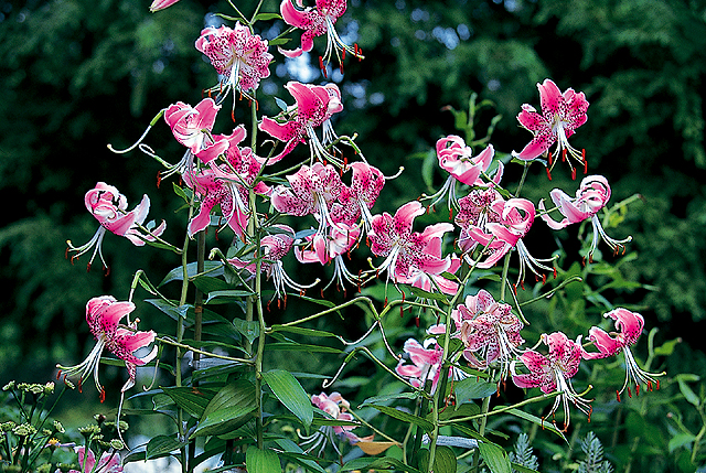 【咲き競うユリの花】JR西立川駅に近い国営昭和記念公園は「緑の回復と人間性の向上」をテーマに建設されており、四季折々の花も美しい。池の畔に咲いていたユリの花の群生は見事な美しさを競っていた。周囲の風景とは異質な印象を受けたので花だけフレームした。