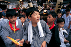 【祭りの子どもたち】岩走神社の祭礼は、御輿と獅子と太鼓の行列が練り歩く。男児は御輿に群がり興奮気味だった。人混みの中の撮影には24ミリは便利だ。