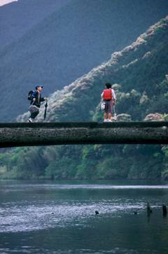 朝日新聞社主催「日本の自然」写真コンテスト高知県一等受賞作品【待って】現在、全校生徒7名の口屋内分校です。沈下橋の向かいに小学校があり、橋を渡って通学する5名が、朝、橋のたもとに集まり仲良く通学しております。左記の舟より約8km上流です。夏の川原はカヌーイスト達が大勢集まりキャンプなど憩いの場所となります。