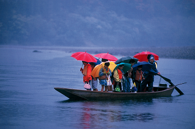 二科会写真部コンテスト入選【通学路】日本有数の清流、四万十川の中流域で川の対岸に小学校の分校がありました。下流には沈下橋という欄干のない橋がありますが、子供達の集落からは約5kmの道を迂回しなければなりません。舟で渡れば500mの近道です。素敵な通学風景でしたが、残念ながら一昨年から本校に統合され廃校となり、渡し船は廃止されております。