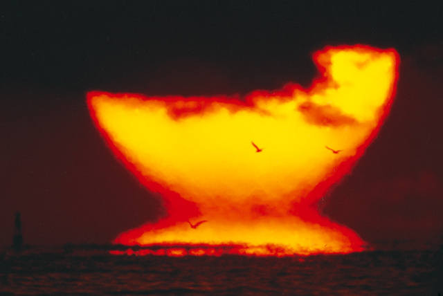 「第八回 公募AMATERAS展」グランプリ受賞作品【欠けたグラス】水面にガスがかかり今日は駄目かなと帰り支度を始めた矢先、雲の切れ目から大自然の壮大なドラマが始まりました。好きなワイン、手にしたグラスが欠けたような夕日、鳥が二羽、三羽、私の思いをかなえてか夕日に溶け込んでくれました。息を止め、私が写真を始めて最大のチャンスに幸せをかみしめながらシャッターを切りました。