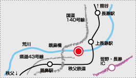 (5)秩父鉄道・親鼻駅下車、駅前より県道43号線を長瀞方面へ徒歩5分ほどで国道140号線を横切り、さらに荒川沿いに2〜3分。 |